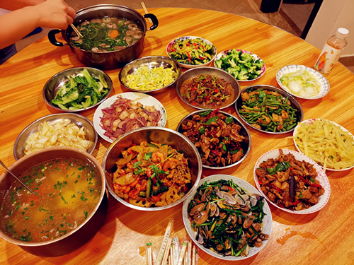 有的洗菜、有的切菜、有的殺雞、有的剖魚(yú),干得熱火朝天,一片熱鬧。
